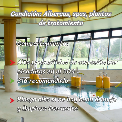 Por eso vemos inoxidable en albercas, spas, plantas de tratamiento y hospitales.
