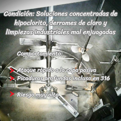 El daño ocurre cuando los iones cloro (Cl⁻) superan la capacidad de la capa pasiva de óxido de cromo.