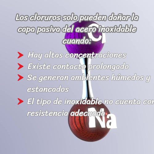 El problema no es el ion cloro en sí, sino la concentración, el tiempo de contacto y el tipo de inoxidable. En condiciones controladas, muchos inoxidables funcionan correctamente.