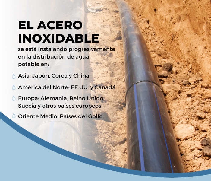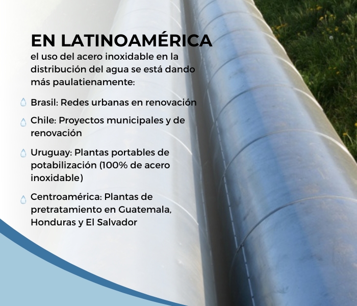 En Latinoamérica, la red de distribución de agua de Sao Paulo, que presenta fugas del 30% del suministro, ha iniciado la transición hacia el acero inoxidable, así como otros países.